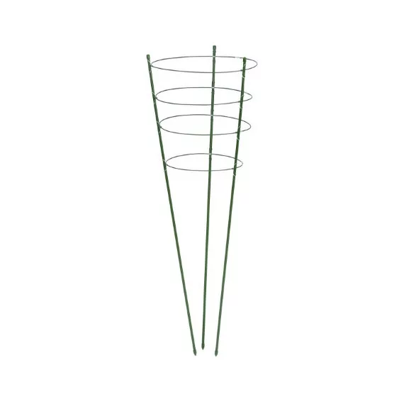 A 6040340 virágtámasz 60 cm magas, műanyaggal bevont fém szerkezetből készült, zöld színben. Három különböző átmérőjű gyűrűt tartalmaz (18, 20 és 22 cm), amelyek könnyen rögzíthetők a fő tartóhoz, így a növények stabilan támaszkodhatnak és rendezett formában nőhetnek.